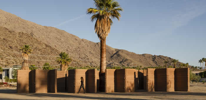 Combinar antigos métodos de construção em terra com a arquitetura moderna. Foi com essa ideia que o artista e arquiteto norte-americano Ronald Rael ergueu a obra Adobe Oasis, em Palm Springs, nos Estados Unidos, próximo da fronteira com o México. A instalação fez parte da exposição internacional Desert X, que terminou recentemente, organizada pelo coletivo de arte com o mesmo nome, que promove arte contemporânea em diálogo com ambientes desérticos no Vale de Coachella.