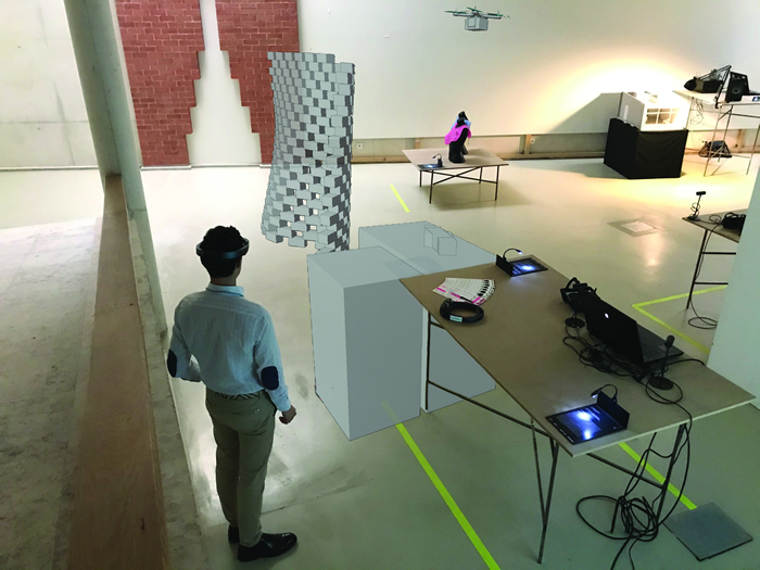 Imagem: Simulação da visualização em RA da construção de uma parede com drones | D.R.